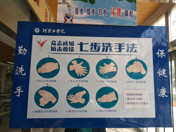 39.在就餐场所配备足够的可以正常使用的洗手消毒设施,洗手设施上方张贴规范洗手步骤示意图,全面普及“内-外-夹-弓-大-立-腕”的七步洗手法,引导师生餐前洗手并成为习惯。