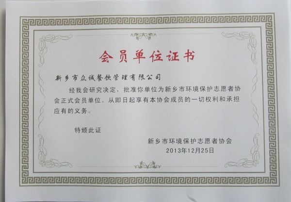 新乡市众诚餐饮管理有限公司被新乡市环境保护志愿者协会评为"绿色安全餐饮单位"!